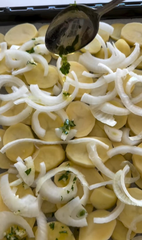2. Slice the potatoes into rounds about 3–4 mm thick and the onion into thin julienne strips. Arrange them on a baking tray with a good pinch of coarse salt and a drizzle of EVOO. Bake at 180°C (350°F) for about 25 minutes. We want them to start softening and browning slightly, creating the perfect nest for our sea bass.