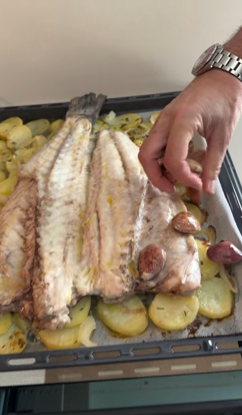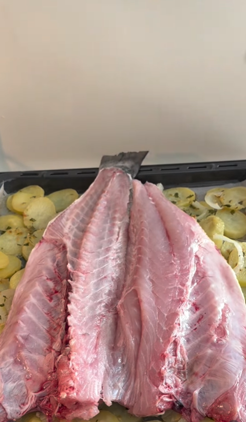 3. Remove the tray and place the XXL butterflied sea bass over the potatoes. Pour the white wine around the edges (be careful: never pour it over the fish skin, or it will lose its texture!). Put it back in the oven at 180°C (350°F) for 15–18 minutes. The exact time depends on the thickness of your fish, but the goal is to cook it through without drying it out.